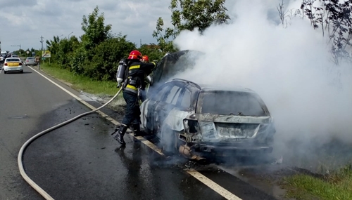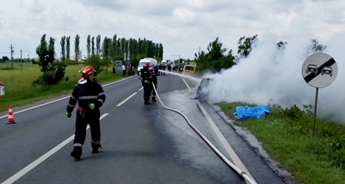 Un autoturism a luat foc din mers, intre localitatile Sag si Jebel, si a ars ca o torta pana la venirea pompierilor. Dauna totala.