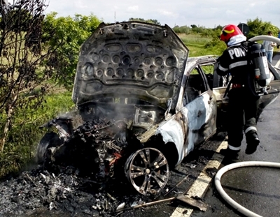 “ISU Timis a fost solicitat sa intervina pentru lichidarea unui incendiu la un autoturism, la iesire din localitatea Jebel. La momentul producerii incendiului, in autoturism se aflau 2 persoane, autoturismul aflandu-se in mers.