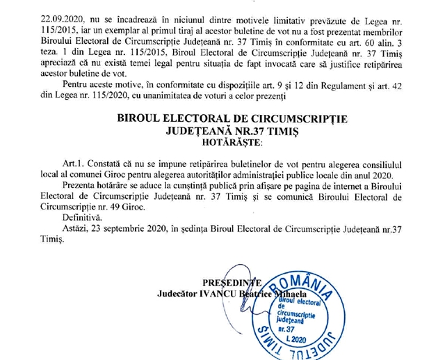 Potrivit Hotararii 79/23.09.2020, a Biroul Electoral de Circumscriptie Judeteana Nr. 37 Timis, “nu se impune retiparirea buletinelor de vot pentru alegerea consiliului local al comunei Giroc”, o decizie contestata de candidatii independenti. (Mara Ion)