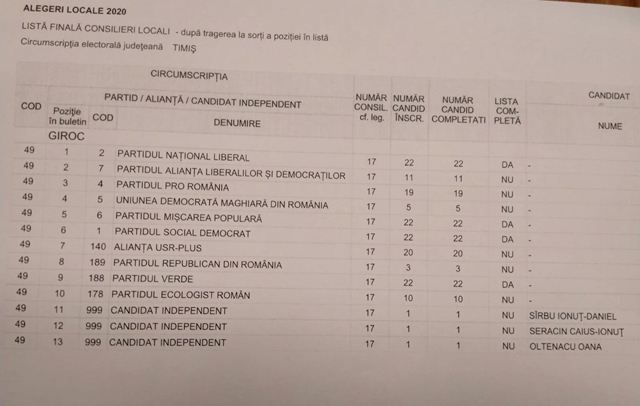 Este vorba despre Seracin Caius-Ionut, Oltenacu Oana si Sarbu Ionut-Daniel, care au remarcat ca, pe buletinele de vot pentru alegerea Consiliului Local Giroc, nu este respectata ordinea stabilita prin tragere la sorti.