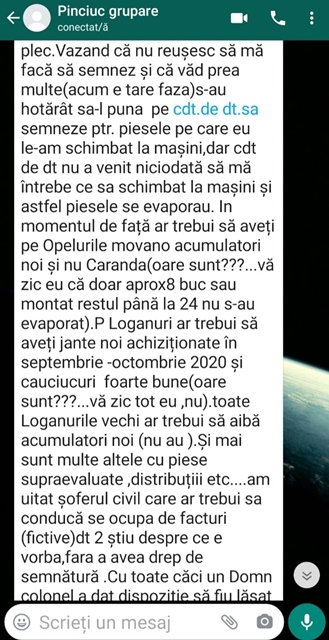 “Va salut, domnilor. Va aduc la cunostinta ca biroul parc auto, impreuna cu stiu ei cine, vor sa-mi insceneze furtul unor piese care s-au evaporat ori pe drum spre unitate, ori din unitate.