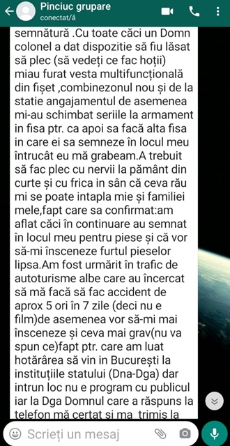 “Va trimit mesajele colegului nostru Plt.maj Pinciuc Alin pe care le-a trimis intregului personal in datele de 26 si 27.12. Pe scurt, Pinciuc, pana la inceputul lunii noiembrie, a fost coleg cu noi, apoi s-a suspendat timp de 1 an, deoarece, in 04.11, a suferit un accident de munca in garajul unitatii in timp ce repara o masina, el fiind incadrat ca luptator si neavand ce sa caute in parcul auto. Nu stim cum s-a finalizat ancheta desfasurata la unitate, dar la scurt timp si-a depus un raport de suspendare si a intrerupt legaturile cu noi toti, pana in datele de 26 si 27.12.2020, cand majoritatea am primit urmatoarele mesaje”, este mesajul primit la redactie de la reprezentantii “Colectivului cinstit al unitatii”.
