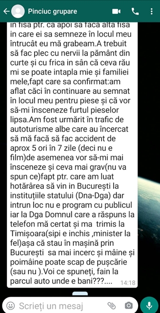 “A trebuit sa fac plec cu nervii la pamant din curte si cu frica in san ca ceva rau mi se poate intampla mie si familiei mele. Fapt care s-a confirmat: am aflat ca, in continuare, au semnat in locul meu pentru piese si ca vor sa-mi insceneze furtul pieselor lipsa. Am fost urmarit in trafic de autoturisme albe, care au incercat sa ma faca sa fac accident de aprox 5 ori in 7 zile (deci nu e film). De asemenea, vor sa-mi mai insceneze si ceva mai grav (nu va spun ce) fapt ptr. care am luat hotararea sa vin in Bucuresti, la institutiile statului, DNA – DGA”, spune Pinciuc intr-o serie de mesaje telefonice trimise, in 26 si 27 decembrie, colegilor sai de la Gruparea de Jandarmi Mobila Timisoara.