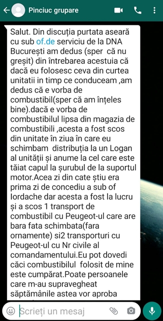 “Salut. Din discutia purtata, aseara, cu subof. de serviciu de la DNA Bucuresti am dedus (sper ca nu gresit), din intrebarea acestuia ca, daca eu folosesc ceva din curtea unitatii, in timp ce conduceam, am dedus ca e vorba de combustibil (sper ca am inteles bine).