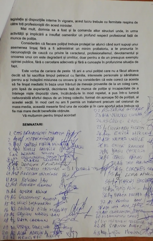 “Nu consideram ca este corect ca acesta sa fie linsat mediatic in baza unor franturi de mesaje provenite de la un coleg care, prin lipsa de experienta, dezinteres fata de munca de politie si incapacitatea de a intelege niste dispozitii clare, incalcandu-le in mod repetat, a pus intr-o lumina nefavorabila efortul depus de un intreg colectiv, format din aproape 50 de politisti, al acestei sectii”, se mentioneaza in scrisoarea deschisa adresata Ministerului Afacerilor Interne, Inspectoratului General al Politiei Romane, mass-media si sindicatelor din Politia Romana.