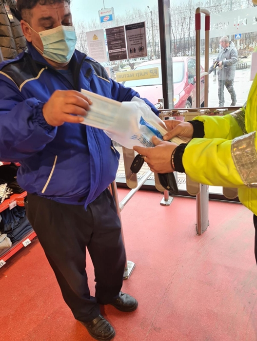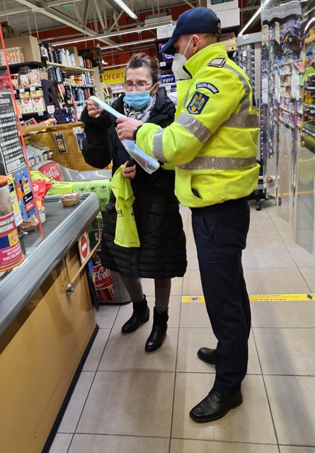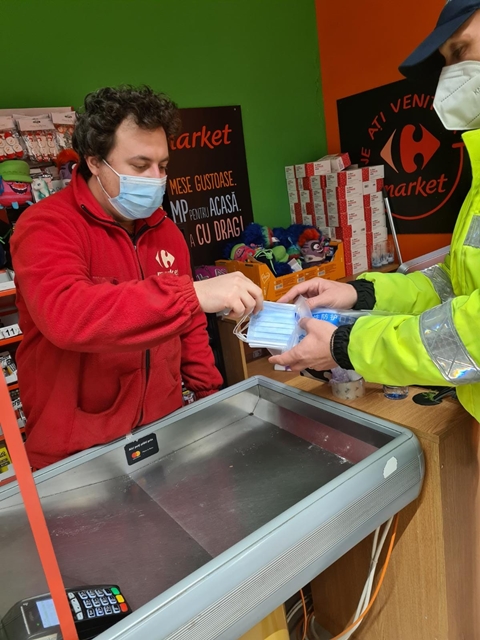 Masti de protectie, nu amenzi Covid-9! Politistii din Giroc au impartit 150 de masti cetatenilor aflati in centrele comerciale din comuna