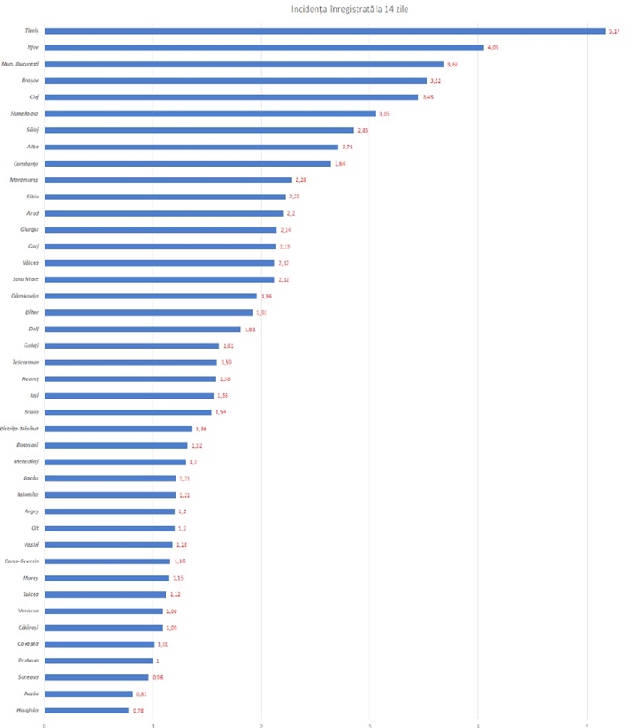 Judetul Timis se mentine la o rata de infectare cu coronavirus de peste 5 persoane la 1000 de locuitori (5,17), cumulate la 14 zile, fiind urmat de Ilfov (4,05), Bucuresti (3,68) si Brasov (3,5).