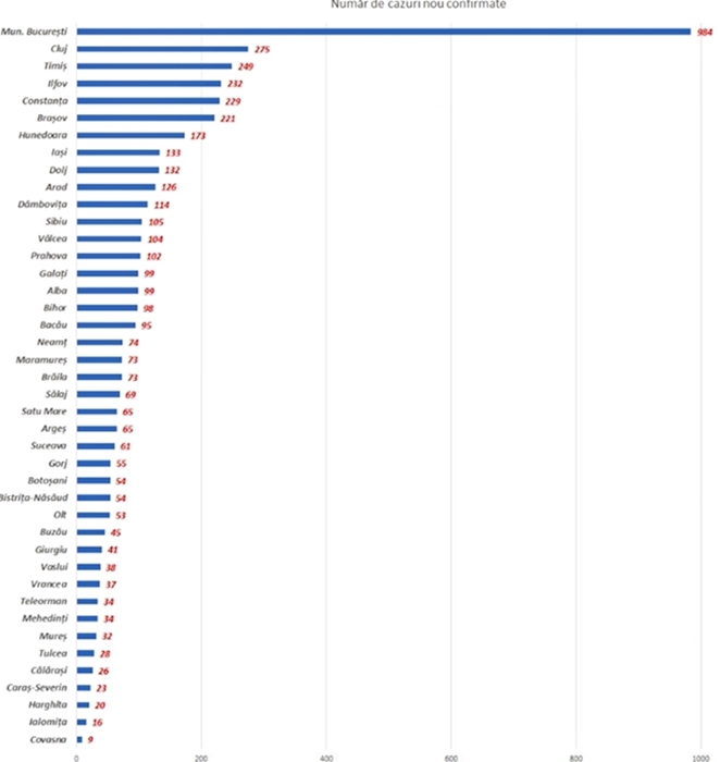 Clujul se mentine la peste 270 de cazuri noi /zi, iar Timis se apropie de 250. La polul opus gasim Covasna (9 cazuri noi de infectare), Ialomita (16 cazuri in ultimele 24 de ore) si Harghita (cu 20 de cazuri noi de infectare). In 14 judete au fost raportate peste 100 de cazuri noi in ultimele 24 de ore. (G.G.)