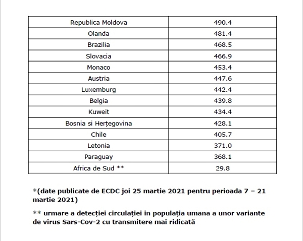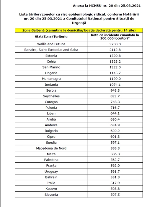 Art.5 – Se aproba lista tarilor/zonelor/teritoriilor de risc epidemiologic ridicat pentru care se instituie masura carantinei asupra persoanelor care sosesc in Romania din acestea, prevazuta in anexa.