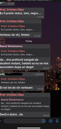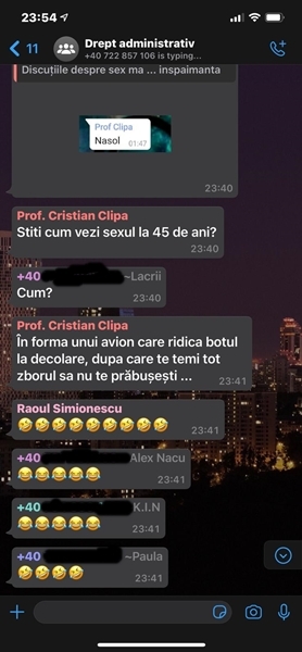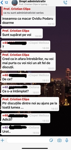 Cred ca am gresit. Imi cer scuze celor care au fost deranjati de glumele de pe acest grup. Voi mentine grupul doar pentru intrebari suport, aferente cursului si pentru a va informa asupra eventualei reprogramare a cursului”, a izbucnit conferentiarul Cristian Clipa, in momentul in care a aflat ca discutiile de pe grup au fost distribuite in exterior.