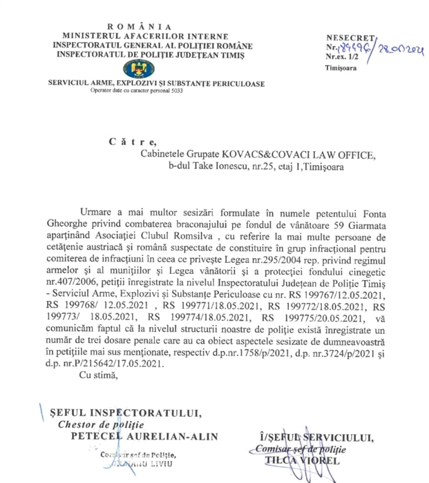 Reamintim ca, in martie 2020, cetateanul austriac Seyfried Harald, alaturi de alti trei conationali, au achizitionat fondul de vanatoare 59 Giarmata, cu suma de 50.000 de euro, de la fostul director Nicolae Stoian. “Adunarea generala” a asociatiei care a aprobat tranzactia a fost formata din fiul sau si fiica sa…