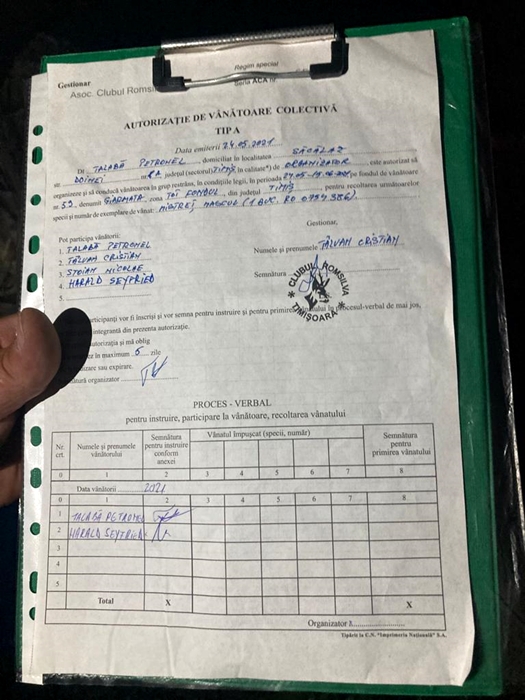 In urma verificarii documentelor, tehnicianul de vanatoare a observat ca autorizatia este incompleta, intrucat nu era specificata data iesirii in teren, ci doar anul, 2021, si a suspectat faptul ca austriacul ar avea asupra sa dispozitive de ochire pe timp de noapte, care sunt strict interzise de lege.