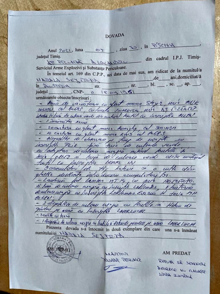 “Autorizatia incompleta echivaleaza cu lipsa autorizatiei, asa spune legislatia cinegetica. Politistii au ridicat mai multe dispozitive de observare pe timp de noapte, unele cu laser, care vor fi expertizate pentru a se stabili daca puteau fi montate pe arma si folosite ca aparate de ochire pe timp de noapte. Lucru strict interzis.