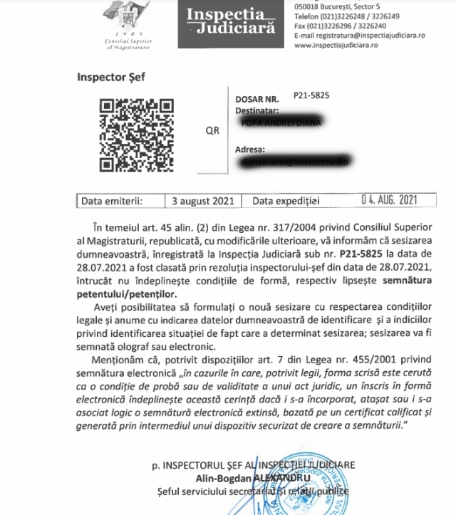 „Va informam ca sesizarea dumneavoastra, inregistrata la Inspectia Judiciara sub nr. P21-5825, a fost clasata prin rezolutia inspectorului sef, intrucat nu indeplineste conditiile de forma, respectiv lipseste semnatura petentului / petentilor”, se mentioneaza in raspunsul la sesizare semnat de Alin Bogdan Alexandru, seful Serviciului secretariat si relatii publice din cadrul Inspectiei Judiciare, cu precizarea ca se poate formula o noua sesizare, cu respectarea conditiilor legale.