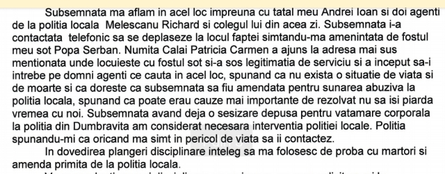 „M-am simtit amenintata de fostul sot si am solicitat prezenta unui echipaj de la Politia Locala. Numita Calai Patricia Carmen a ajuns la adresa de mai sus, unde locuieste cu fostul sot, si-a scos legitimatia de serviciu si a inceput sa-i intrebe pe domnii agenti ce cauta in acel loc, spunand ca nu exista o situatie de viata si de moarte si ca doreste ca subsemnata sa fiu amendata pentru sunarea abuziva la politia locala, spunand ca poate erau cauze mai importante de rezolvat, nu sa isi piarda vremea cu noi. Subsemnata avand deja o sesizare depusa la politia din Dumbravita pentru vatamare corporala, am considerat necesara interventia politiei locale, mai cu seama ca politia mi-a recomandat ca oricand imi simt viata in pericol sa ii contactez”, se mentioneaza intr-o plangere disciplinara depusa la Parchetul de pe langa Judecatoria Timisoara.