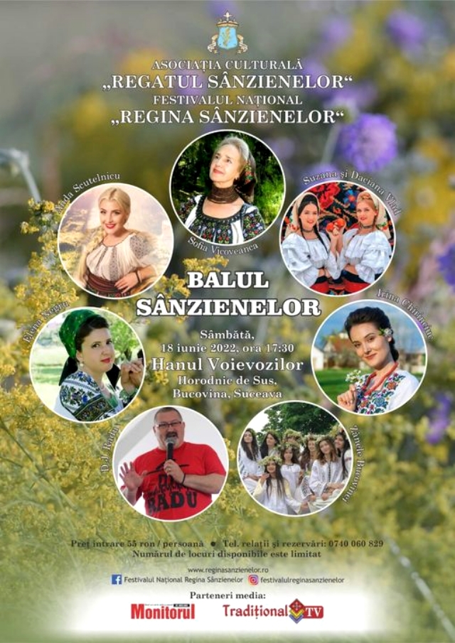 Festivalul National Concurs „Regina Sanzienelor”, aflat la cea de-a VIII-a editie, va fi gazduit, in perioada 18 -19 iunie 2022, de Hanul Voievozilor, din localitatea Horodnic de Sus, judetul Suceava, in traditionalul „Regat al Sanzienelor”. Organizatorul si sufletul acestui festival, omul de cultura Dumitru Parasca, a anuntat ca, in cadrul acestui festival national are loc un concurs tematic, care se desfasoara pe mai multe sectiuni, respectiv Printese (8 – 14 ani), Regine (15 – 101 ani), Grupuri si Costume inspirate din mitologia romaneasca.