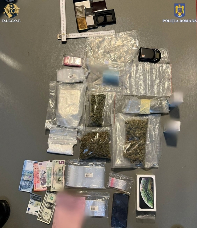 In urma perchezitiilor domiciliare efectuate la data de 02.06.2022 au fost descoperite si ridicate cantitatile de aproximativ 16 kilograme de canabis si 600 grame de cocaina, 2 grindere, 85 de pungi cu urme de substante, 233 de pungi prevazute cu ziplock goale, precum si sumele de 14.200 de lei, 500 de euro si 400 de dolari.
