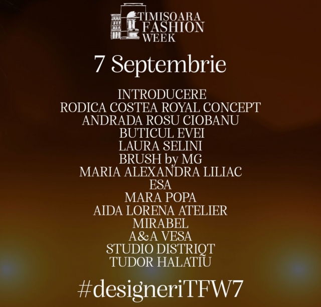 Pe parcursul celor doua zile, publicul va avea ocazia sa admire cele mai noi si spectaculoase creatii semnate de 28 de designeri. Printre acestia, se numara Tudor Halatiu, Aida Lorena Atelier, Mirabel, Laura Selini, A&A Vesa, Felix Ramiro, Alexandra Liliac, Anca Dudas, Royal Concept by RC, Buticul Evei, Toujour, Carolina Design, Chala Couture – Ucraina, Reny M – Ucraina, tineri designeri ai Facultatii de Arte si Design Timisoara si multi altii.