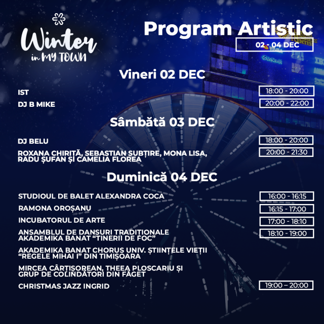 Sarbatorile de iarna inseamna cantece si dansuri traditionale, care vor fi aduse pe scena „Winter in my TOWN” de Ansamblul Akademika Banat „Tinerii de Foc”, Akademika Banat Chorus Universitatea Stiintele Vietii „Regele Mihai I” din Timisoara, Mircea Cartisorean, Theea Ploscariu si de Grupul de Colindatori din Faget. De la ora 19, Ingrid va incheia seara cu cele mai frumoase cover-uri si cantece de iarna interpretate in stil de jazz.