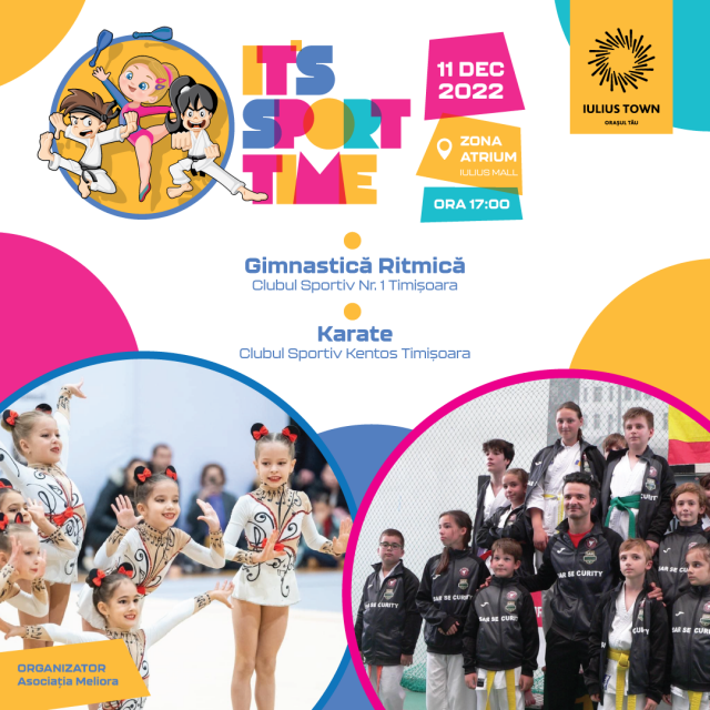 Tot duminica, de la ora 17, sectia de gimnastica ritmica de la Clubul sportiv Nr. 1 Timisoara va sustine un numar spectaculos in Atriumul Iulius Mall. Cei interesati de artele martiale au parte de un adevarat spectacol duminica, 11 decembrie, de la ora 17,30, in Atriumul Iulius Mall. Echipa Kentos va sustine o prezentare de karate, unde va fi prezenta echipa medaliata la concursul mondial Caorle-Italia, dar si alti sportivi apreciati la nivel mondial. Vino sa ii vezi pe tinerii timisoreni care formeaza clubul Kentos!