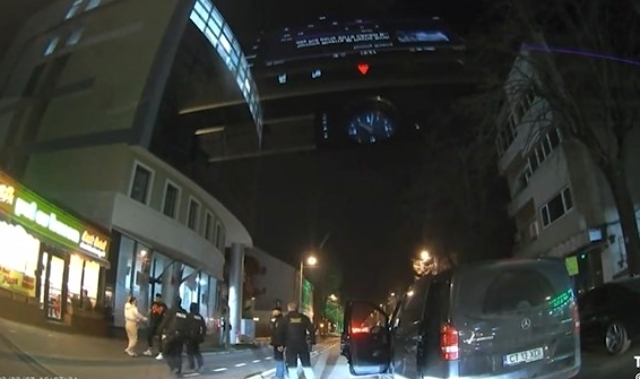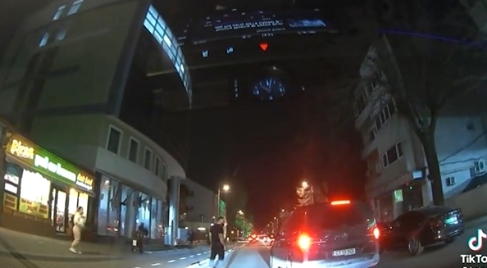 Pe imagini se vede cum tanarul, in varsta de 32 de ani, care este insotit de o femeie, traverseaza neregulamentar si este la un pas de a fi lovit de masina, moment in care s-a intors pentru a-l pune la punct pe sofer.