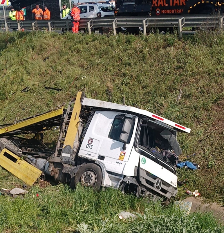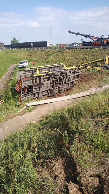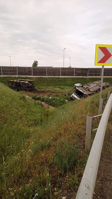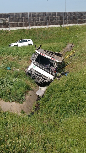 „In noaptea de 8 mai a.c., in jurul orei 0:30, pe breteaua de iesire de pe autostrada A1, la km. 538, calea 1, a avut loc un accident rutier. Din cercetari, a reiesit ca un barbat de 43 de ani, din judetul Valcea, in timp ce conducea un ansamblu rutier, care transporta autoturisme, a pierdut controlul asupra directiei de deplasare si s-a rasturnat in afara partii carosabile.