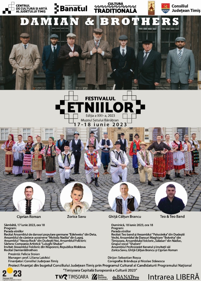 Sarbi, bulgari, evrei, maghiari, rromi, ucraineni, slovaci, germani si machedoni vor recrea atmosfera Banatului de altadata, la Muzeul Satului Banatean din Timisoara. Centrul de Cultura si Arta al Judetului Timis, in parteneriat cu Muzeul Satului Banatean, cu sprijinul financiar al Consiliului Judetean Timis, prin Programul National ”Timisoara Capitala Europeana a Culturii 2023”, organizeaza cea de-a XXII-a editia a Festivalului Etniilor in zilele de 17 si 18 iunie 2023 la Muzeul Satului Banatean din Timisoara, str. Avram Imbroane, nr.1.