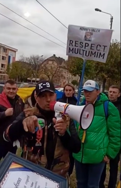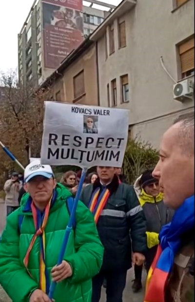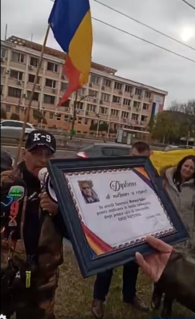 “Veti ramane o legenda si o istorie a Politiei Romane”, a strigat organizatorul mitingului, Claudiu Olar, fost instructor de caini in Ministerul de Interne, dupa cum s-a prezentat, care i-a oferit lui Valer Kovacs – vicelider de sindicat la DECUS, pe vestul tarii – o diploma de erou national.