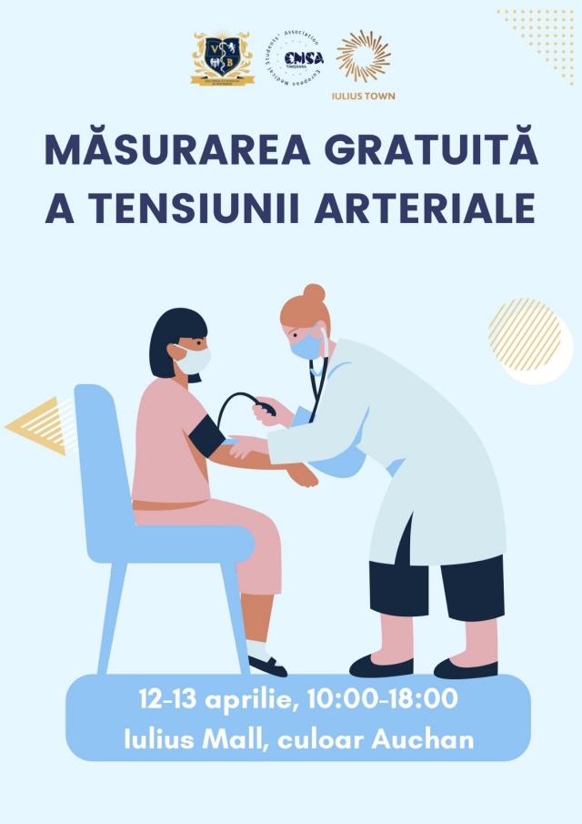 In Iulius Mall, zona Auchan, voluntari de la European Medical Students’ Association Timisoara (EMSA Timisoara) vor masura gratuit tensiunea celor interesati. Acestia va asteapta vineri si sambata, in intervalul orar 10.00 – 18.00. (Iulius Town, Departament PR)