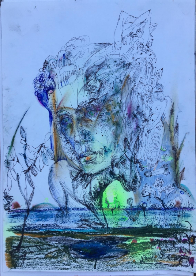 El rememoreaza un moment – cheie in creația sa. „Puterea de convingere a liniei a fost determinata in noiembrie 2015. Intr-o noapte la hotelul Ibis din Bucuresti, G. L. mi-a pregatit un mic dejun cu 48 de carioci, o revista Soimii patriei si o para. M-a repoziționat in raport cu pictura pe panza si m-a impacat cu linia. Un exercițiu simetric, primele mele scrawls-uri s-au intamplat in 1979 pe caietele de lecții de franceza ale mamei mele”.