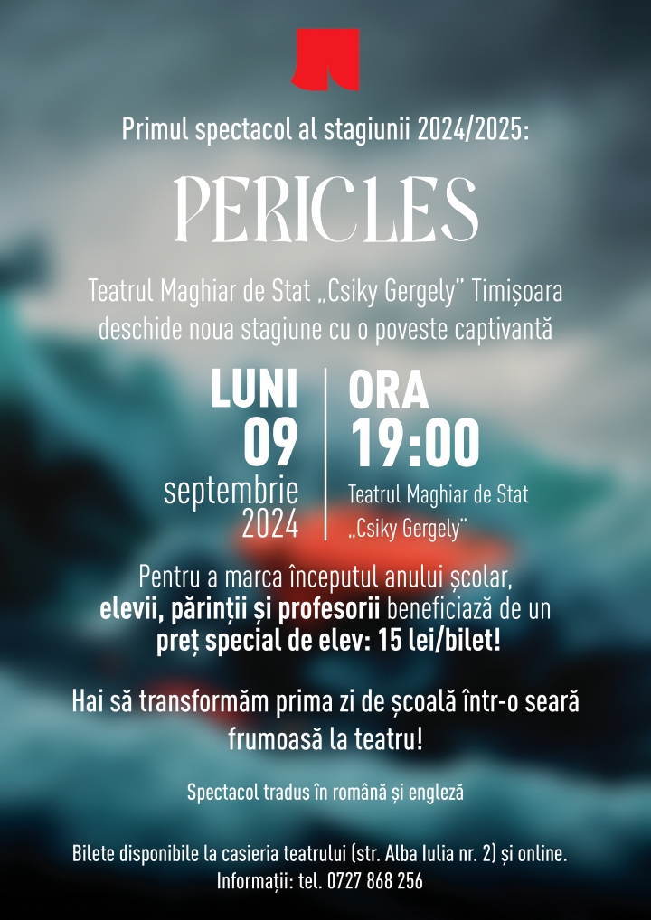 Teatrul Maghiar de Stat „Csiky Gergely” din Timisoara va invita luni, 9 septembrie 2024, la deschiderea stagiunii 2024/2025 cu spectacolul „Pericles” in regia lui Philip Parr. In ziua care marcheaza inceputul noului an scolar, teatrul aduce pe scena o poveste captivanta si educativa despre un tanar care isi gaseste drumul in viata si invata care sunt adevaratele valori.