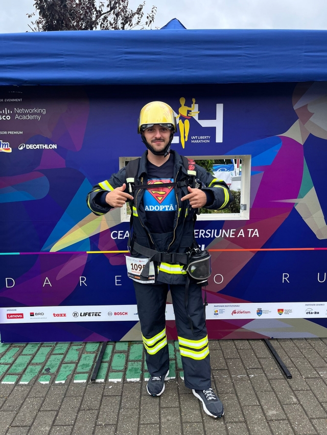 Printre cei cateva mii de sportivi care au participat, in ultimele doua zile, la UVT Liberty Marathon, s-a numarat si un tanar aparte, a carui misiune a fost una speciala: sa promoveze adoptia. Este vorba despre domnul Ghise Mihai Nicusor, care este incadrat la Sectorul Politiei de Frontiera Jimbolia – Inspectoratul Teritorial al Politiei de Frontiera Timisoara si pompier voluntar in cadrul Serviciului Voluntar pentru Situatii de Urgenta, Jimbolia.