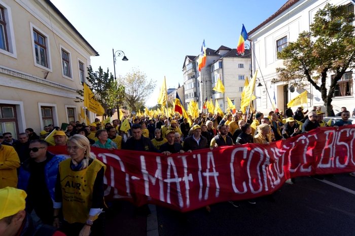 Peste 2.000 de romani, membri si simpatizanti AUR, au protestat sambata, in municipiul Bistrita, impotriva abuzurilor facute de PSD in incercarea de a scoate AUR din cursa electorala.