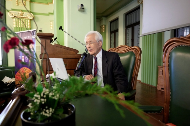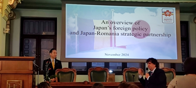 In cadrul prezentarii sale, distinsul oaspete a realizat o trecere in revista a situatiei geopolitice mondiale actuale, subliniind faptul ca tara sa este mai apropiata de valorile euro-atlantice, iar in acest sens a fost semnat, anul trecut, parteneriatul strategic intre Japonia si Romania.