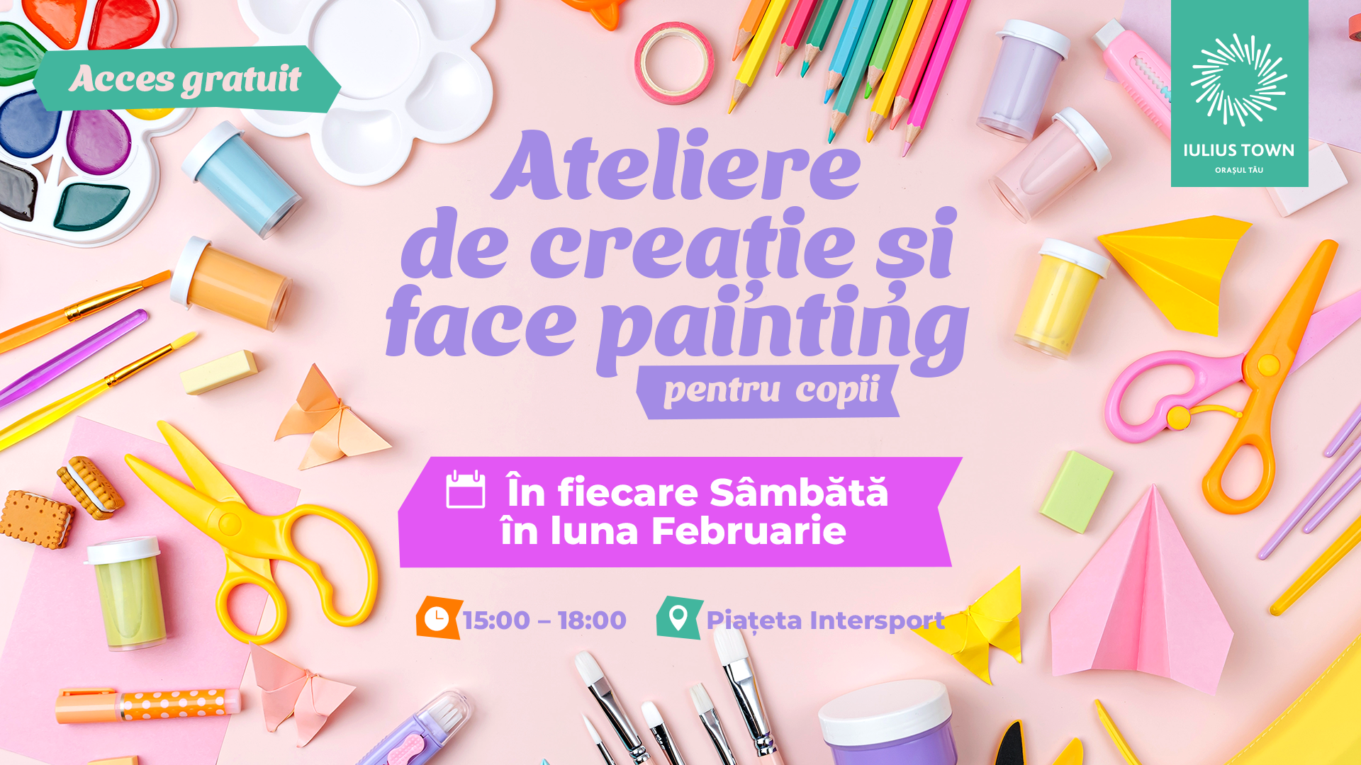 Cei mici sunt asteptati, sambata, la Atelierele de Creatie si face painting, unde vor petrece momente pline de culoare si distractie. In intervalul orar 15.00 – 18.00, vor combina nuante vibrante cu pietricele stralucitoare, pentru a crea opere de arta unice si pline de sclipire. De asemenea, vor avea ocazia sa se „transforme” in personajele lor preferate in cadrul sedintelor de face painting. Participarea la activitati este gratuita, in limita locurilor disponibile. (Iulis Town, Departament PR)