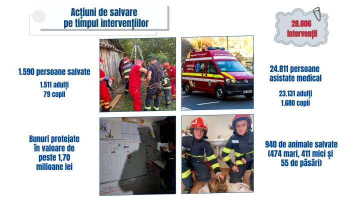 De partea cealalta, generalul Lucian-Vasile Mihoc a mentionat faptul ca ISU Timis este pe locul 2, la nivel national, dupa Bucuresti si Ilfov, cu aproape 30.000 de interventii, in 2024, cand s-au protejat bunuri in valoare de peste 1,7 milioane de lei, nu mai putin de 1590 de persoane au fost salvate din calea flacarilor sau a inundatiilor, aproape 25.000 de persoane – asistate medical, totodata pompierii militari banateni salvand 940 de animale.