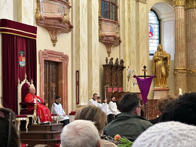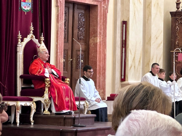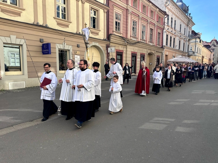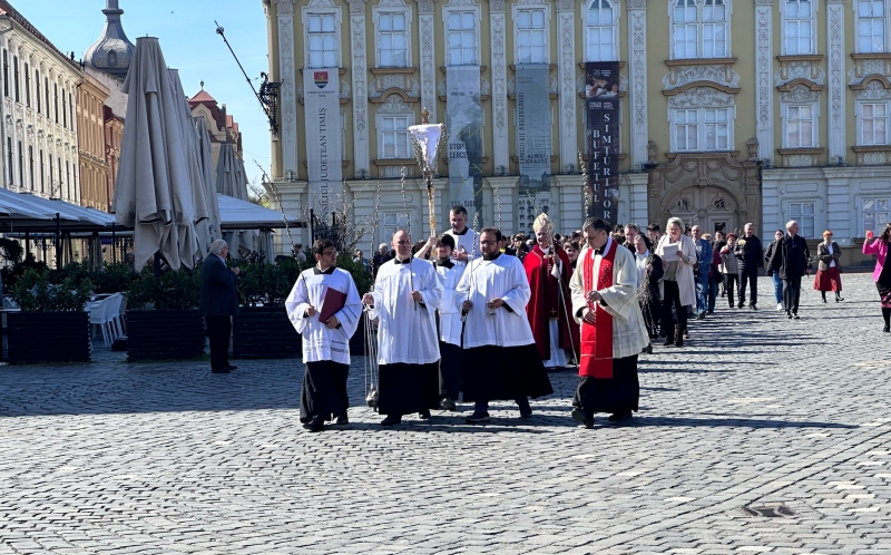 Sarbatoarea a inceput la ora 10,30, cu sfintirea ramurilor in curtea Palatului Episcopal, urmata de o procesiune solemna spre Dom, unde a avut loc Sfanta Liturghie Pontificala. Ceremonia a fost oficiata de Excelenta Sa Iosif Csaba Pál, episcopul de Timisoara.
