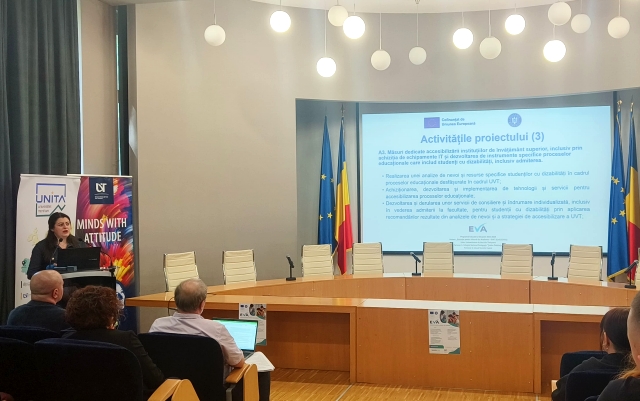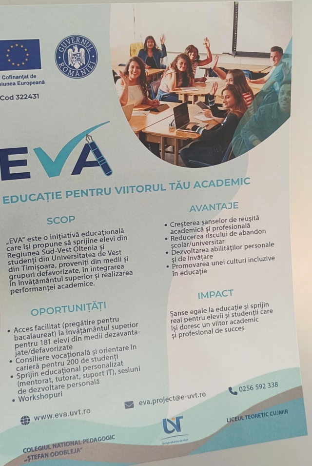 In cadrul Universitatii de Vest Timisoara (UVT) a avut loc astazi, 16 aprilie 2025, de la ora 13, lansarea proiectului „Educatie pentru Viitorul tau Academic – EVA”. Este implementat de UVT alaturi de parteneri sai, Colegiul National Pedagogic „Stefan Odobleja” din Drobeta Turnu-Severin si Liceul Teoretic Cujmir.