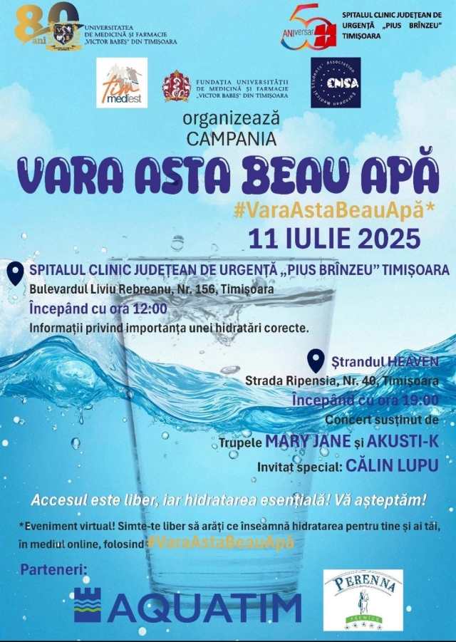 Initiativa, organizata cu entuziasm de catre Spitalul Clinic Judetean de Urgenta „Pius Brinzeu” Timisoara, alaturi de Universitatea de Medicina si Farmacie „Victor Babes”, CNSA, TIM MEDFEST, AQUATIM si PERENNA, a adus in prim-plan un mesaj esential: hidratarea salveaza vieti, imbunatateste calitatea vietii si este la indemana oricui.