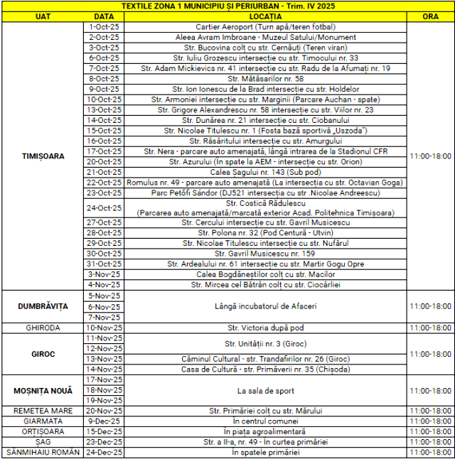 Utilizatorii casnici din localitatile mentionate pot preda GRATUIT, prin aport voluntar, deseurile textile la punctele de colectare stabilite, conform programului din tabelele* de mai jos: