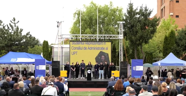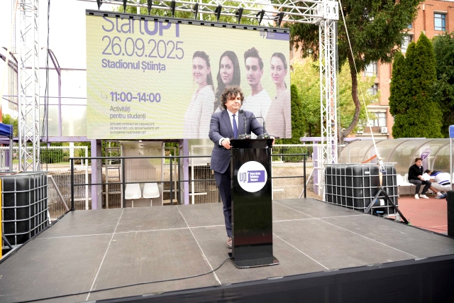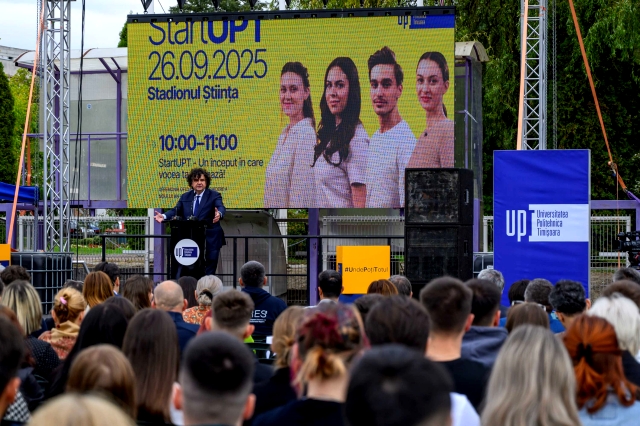 Ceremonia de deschidere a anului universitar 2025-2026 la Universitatea Politehnica Timisoara a avut loc vineri, 26 septembrie 2025, pe Stadionul Stiinta, in prezenta studentilor, a parintilor acestora, a cadrelor didactice, a conducerii UPT si a invitatilor din mediul economic. Evenimentul a avut o semnificatie speciala, prin decizia conducerii UPT de a oferi studentilor sansa de a transmite, de pe scena festivitatii, mesajele si preocuparile generatiei actuale.
