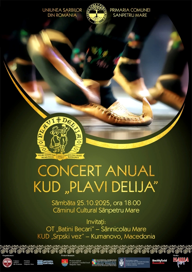 Concertul aniversar are ca scop promovarea valorilor culturale si spirituale ale comunitatii sarbe, dar si consolidarea dialogului intercultural in Banat. Prin dans, cantec si port popular, participantii vor aduce in fata publicului bogatia traditiilor noastre si frumusetea multiculturala a regiunii. (Ansamblul Plavi Delija, Sanpetru Mare)