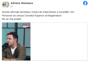 „Aceste afirmatii dovedesc nivelul de imbecilizare a societatii ‘noi’. Personal voi sesiza Consiliul Superior al Magistraturii. Nu se mai poate!”, a transmis magistratul intr-o postare pe retelele de socializare.