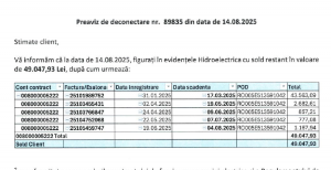 Am sunat la cei de la Hidroelectrica sa le spun ca, sigur, e o greseala. Mi-au spus ca vor verifica si, daca e o greseala, va fi o compensare cu facturile viitoare. In lunile care au urmat, debitul a fost mentinut, ajungand in august 2025 la aproape 50.000 de lei. N-am achitat factura, de unde 10.000 de euro”, ne-a declarat Vasilica Goldic.
