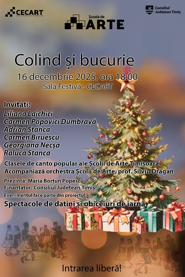 Centrul de Cultura si Arta al Judetului Timis, institutie de cultura aflata in subordinea Consiliului Judetean Timis, va invita la spectacolul „Colind si bucurie”, care va avea loc marti, 16 decembrie, de la ora 18, in sala festiva a Centrului de Cultura si Arta al Judetului Timis.