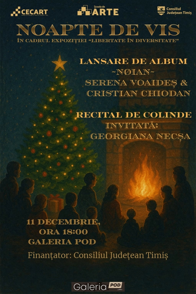 Spectacolul va fi prefatat de un alt captivant eveniment muzical, in acelasi spirit. In 11 decembrie, la ora 18, in Galeria Pod a Centrului de Cultura si Arta al Judetului Timis se desfasoara ”Noapte de vis”, un eveniment care reuneste lansarea albumului ”Noian”, realizat de Serena Voaides & Cristian Chiodan si un recital de colinde sustinut de Georgiana Necsa. Intrarea este libera! (Centrul de Cultura si Arta al Judetului Timis, Comunicat)