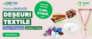 RETIM Ecologic Service S.A., in parteneriat cu ADID Timis, anunta o noua campanie trimestriala pentru predarea gratuita a deseurilor textile, in Zona 1 Timisoara, jud. Timis. Utilizatorii casnici se pot debarasa legal si GRATUIT de deseurile textile din gospodarie.