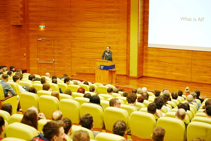 Publicul a fost purtat printr-o istorie fascinanta a domeniului: de la pionieratul robotului Shakey in anii ’60, la „iarna AI” din perioada 1974-1980 si pana la momentele de cotitura precum victoria sistemului Deep Blue impotriva lui Garry Kasparov. AI este, in esenta, despre optimizare si algoritmi care ajuta la luarea deciziilor corecte in conditii de incertitudine, a punctat invitatul de la Stanford.