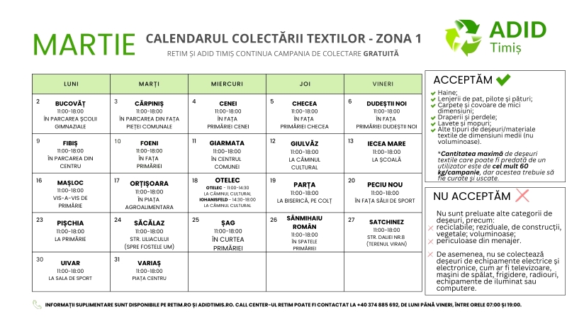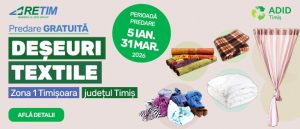 Campania de colectare a deseurilor textile lansata la inceput de an merge mai departe si in luna martie. RETIM Ecologic Service S.A., in parteneriat cu ADID Timis, continua prima campanie trimestriala din 2026 dedicata predarii gratuite a textilelor in Zona 1 Timisoara, judetul Timis.