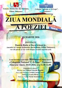 Doi membri ai Filialei Timisoara a Uniunii Scriitorilor din Romania, Daniela Ratiu si Doru Arazan jr., impreuna cu elevi si profesori ai Colegiului National C.D. Loga din Timisoara, vor sarbatori Ziua Mondiala a Poeziei.